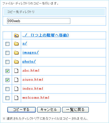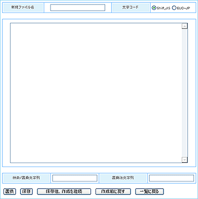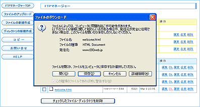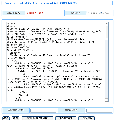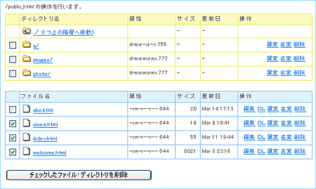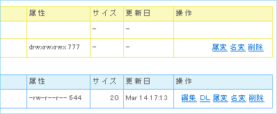 ■属性変更 … 処理メニューの「属性」をクリックしてください。属性(パーミッション)の変更を行うことができます。 (次項参照) ■名前変更 … 処理メニューの「名変」よりファイル・ディレクトリ名の変更ができます。 ■削除 … ファイル・ディレクトリを削除することが出来ます。 ■ファイル編集 …ファイルマネージャ上でファイルの編集が行えます。(下図参照) ■ファイルのダウンロード …処理メニューの「DL」をクリックしてローカルPC上に保存することができます。(下図参照) ■ファイル表示 …ファイル名をクリックするとブラウザ上でファイルを表示します。ディレクトリ名をクリックするとそのディレクトリ内へ移動します。 ▼ファイルの編集
