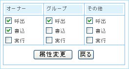 ■オーナー …利用者(あなた)のことです。 ■グループ …サーバー上の同じグループに属するユーザーです。 ■その他 …あなたのサイトにアクセスしてくる一般ユーザです。 090webServerでは以下の設定を推奨します。